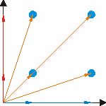 Si l'on reprend l'exemple de la modulation QAM 16, nous aurons par axe, donc par porteuse, deux vecteurs d'argument 0 et de modules représentant le taux de modulation d'amplitude utilisé et deux autres vecteurs de même module, mais d'argument égal à 180°. Comme les porteuses sont en quadrature, nous obtenons ceci, dessiné pour un seul quadrant. Bien entendu, la représentation complète reconstitue exactement la constellation vue plus haut. Au bout du compte, nous pouvons même oublier la représentation quadratique et raisonner sur une seule porteuse, qui sera modulée avec une amplitude (module du vecteur, sa longueur) et une phase (argument du vecteur, son angle) calculée par cette méthode.