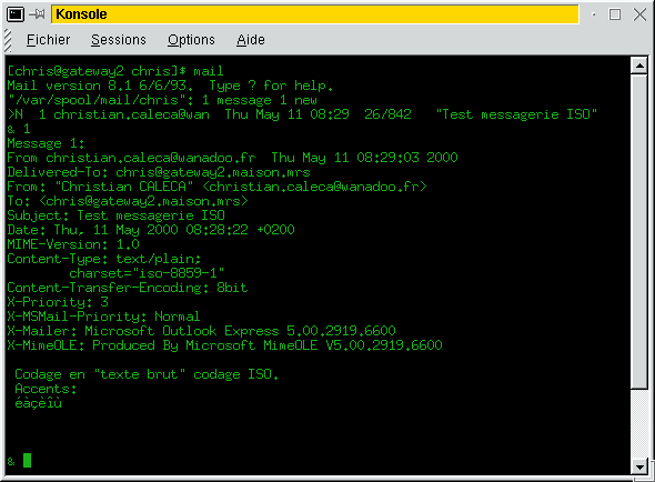 Pour illustrer ceci, nous allons envoyer des messages avec Outlook Express et nous allons les lire avec un outil rustique sous Linux : l'outil « mail ». Cet outil fonctionne en mode texte. Plus rustique, vous n'aurez que Telnet.