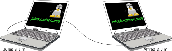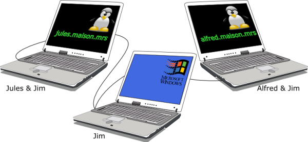 Il y a trois utilisateurs sur ce réseau: Jim, Jules et Alfred. Jules et Alfred travaillent toujours sur la même machine, Jim travaille tantôt sur l'une, tantôt sur l'autre; il dispose donc d'un compte d'utilisateur sur chacune des deux machines.
