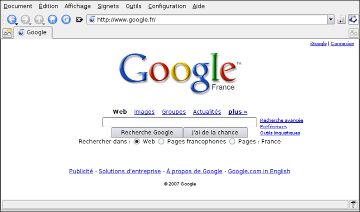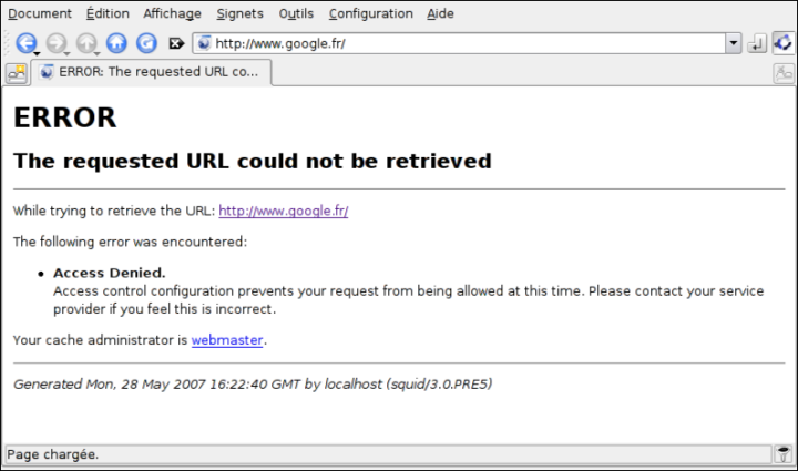 Effectivement, il tourne. N'y aurait-il rien de plus à faire ? Vérifions tout de suite. Squid utilise par défaut le port 3128. Configurons donc un navigateur du LAN pour l'utiliser et essayons un URI au hasard…