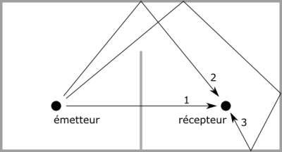 imaginons un émetteur et un récepteur placés dans des salles contiguës. L'émetteur émet dans toutes les directions, si bien qu'il y aura une multitude d'ondes réfléchies, dont certaines atteindront le récepteur. Dans l'exemple, l'onde 1 atteint directement le récepteur, en traversant la cloison, l'onde 2 l'atteint après une réflexion, l'onde 3 après 3 réflexions… Clairement, il y en aura beaucoup plus, avec des chemins différents (plus ou moins longs) et avec des atténuations plus ou moins importantes. Pour une seule source d'émission, le récepteur va recevoir plusieurs fois la même information, plus ou moins atténuée et plus ou moins décalée dans le temps. En acoustique, le problème est bien connu sous le nom de « réverbération » (beaucoup d'échos, avec des décalages temporels très petits).