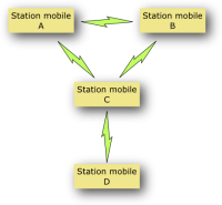 Il n'y a pas dans le réseau de point émetteur/récepteur ayant un rôle particulier. C'est typiquement le mode que l'on choisira si l'on souhaite juste faire communiquer entre elles deux ou trois machines disposant chacune d'une interface Wi-Fi. C'est un mode de fonctionnement rudimentaire, qui peut rapidement devenir compliqué si le nombre de machines en réseau augmente. Chaque station ne peut communiquer qu'avec les stations qui sont à portée. Dans l'exemple : * la station C peut communiquer avec toutes les autres stations, * les stations A, B et C peuvent communiquer entre elles, * la station D ne peut communiquer qu'avec la station C. En aucun cas, la station C ne pourra servir de relais pour que, par exemple, D puisse communiquer avec A. Cet exemple le montre clairement, ce type de réseau n'a d'intérêt que pour permettre à des machines proches (et peu nombreuses) de communiquer entre elles en dehors de toute structure.