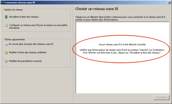 Seulement voilà. Si maintenant, nous essayons d'actualiser la liste des réseaux sans fils, il se produit ceci :