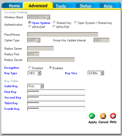 - Le second point est souvent renforcé par les équipementiers en proposant d'introduire non pas une seule clé, mais plusieurs, en indiquant simplement l'index de la clé actuellement utilisée. Autrement dit, l'administrateur pourra configurer les différents noeuds du réseau avec un ensemble de plusieurs clés (4 dans le cas du point d'accès utilisé ici) en indiquant quelle est actuellement la clé utilisée. C'est un complément de protection que ne vaut que si la clé active est souvent changée, et de façon aléatoire, autant que possible. Mais cette procédure de changement de clé active reste manuelle et doit être exécutée sur tous les nœuds du réseau.